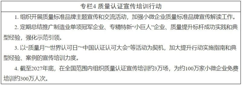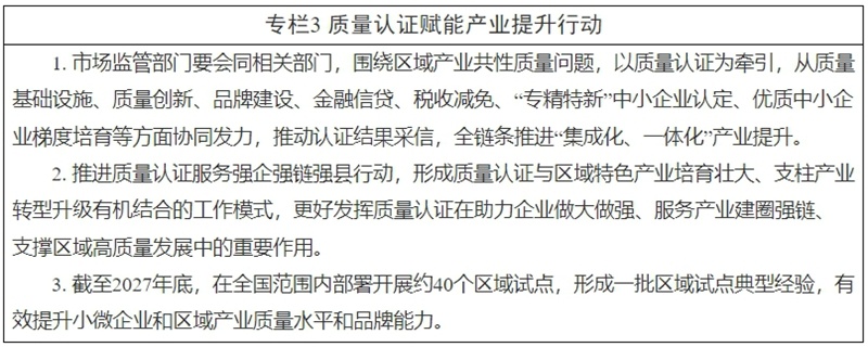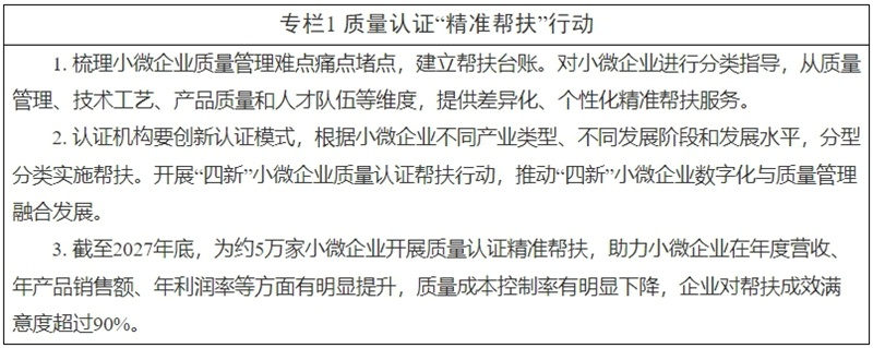 《方案》围绕增强小微企业质量竞争力、提升区域产业质量竞争水平、优化认证服务供给等方面提出了11项重点任务,设置了“质量认证‘精准帮扶’行动”“质量认证强链行动”等4个工作专栏。